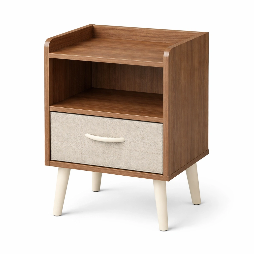 Table de chevet en bois avec tiroir en tissu beige