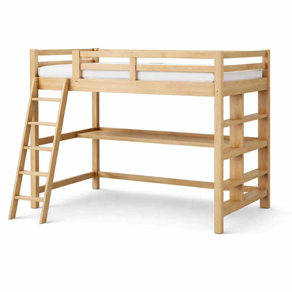 Ce lit mezzanine est fabriqué en bois de pin massif, offrant une structure solide avec des garde-corps horizontaux. Il comprend des étagères intégrées pour maximiser l'espace de rangement. L'échelle est positionnée sur le côté gauche. Les dimensions sont 200 cm de longueur, 90 cm de largeur et 160 cm de hauteur, avec un poids total de 50 kg. Ce lit est conforme aux normes de sécurité européennes pour les lits d'enfants et est recommandé pour les enfants à partir de 6 ans. Le montage est requis.