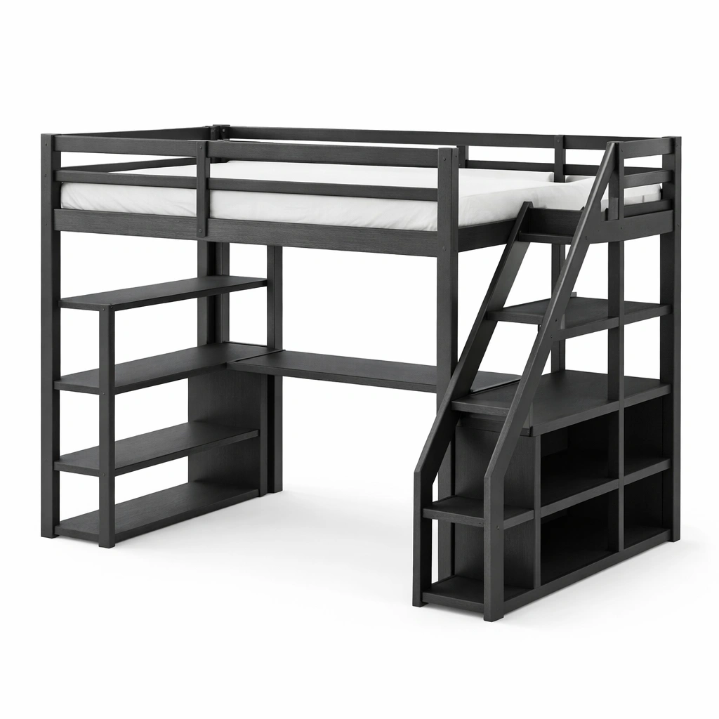 Éléments inclus : Lit avec matelas, Escalier avec rangement, Étagères intégrées
