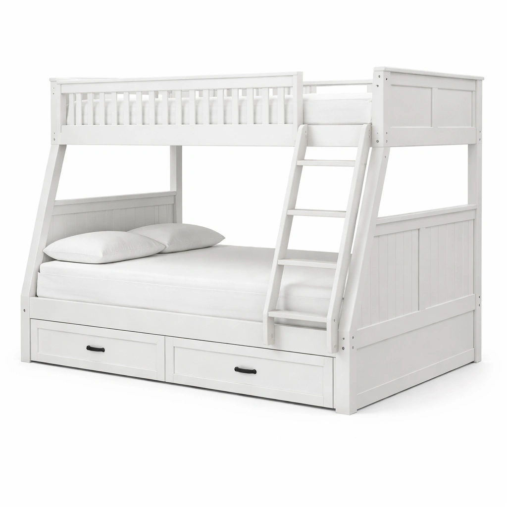 Ce lit superposé est fabriqué en bois de pin massif, offrant une structure robuste. Il est de couleur blanche et mesure 198 cm de long, 141 cm de large et 180 cm de haut. Le lit est équipé d'une échelle intégrée et supporte un poids maximal de 100 kg par lit. Des rangements intégrés sont disponibles sous le lit. Convient aux enfants de 6 ans et plus et conforme aux normes de sécurité EN 747 pour lits superposés.